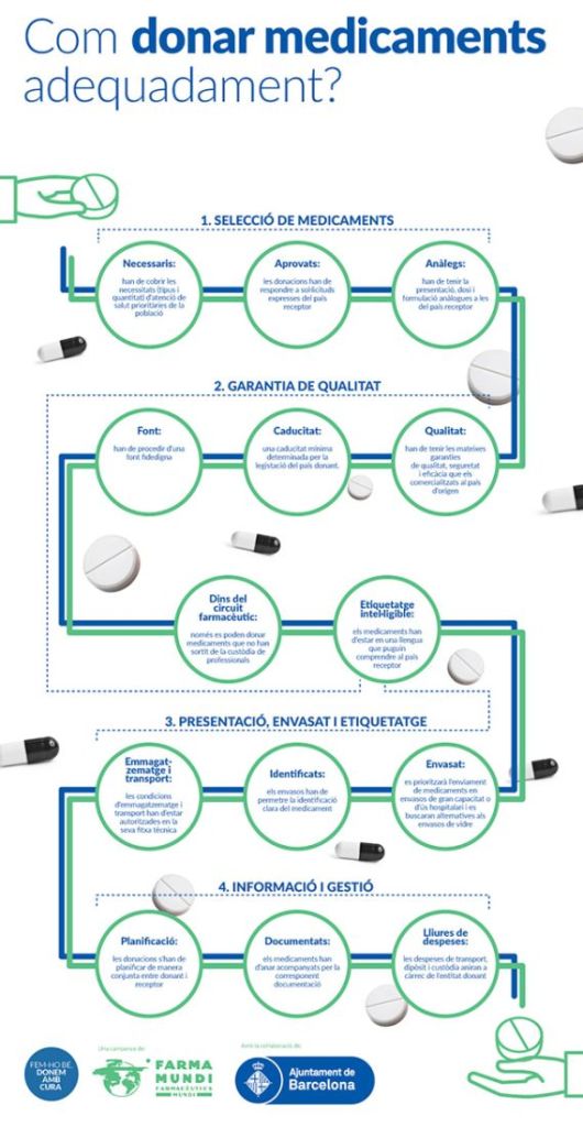 Orientada a informar sobre com realitzar donacions apropiades de medicaments i el perill que suposa utilitzar fàrmacs sobrants i que han sortit del canal farmacèutic. Dirigida a administracions públiques, personal sanitari, ciutadania i a la indústria farmacèutica, la iniciativa renova un missatge que Farmamundi manté viu i que compta amb el suport financer de l’Ajuntament de Barcelona. L’exigència de rigor ha de ser màxima quan es tracta de donacions de medicaments essencials i de garantir la salut de les persones.